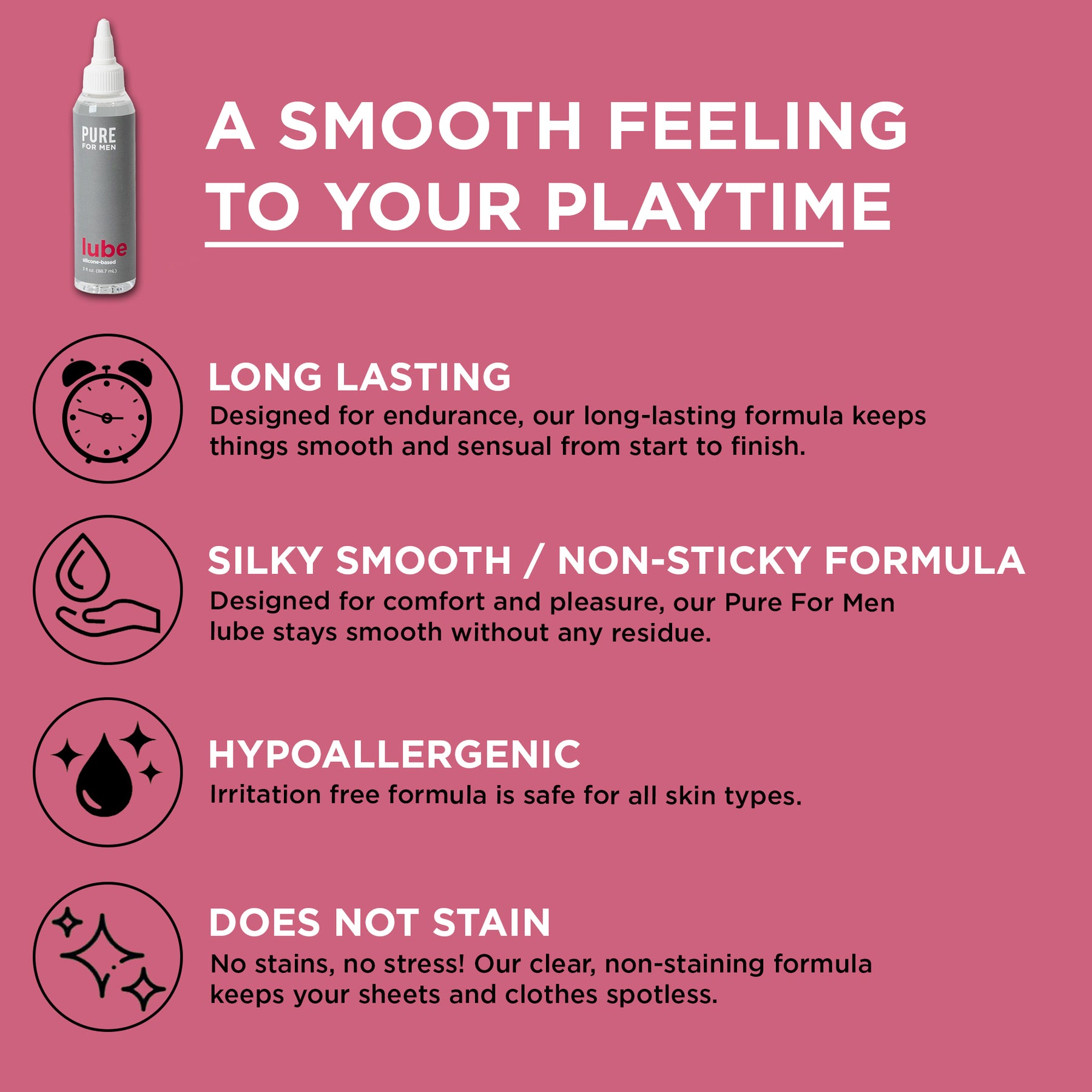 Our silicone-based lube is unlike the rest – Simple Ingredients, Easy Application, Non-Stick Formula, Fragrance Free, Contains Vitamin E, Quick and Easy Cleanup, and Long Lasting.